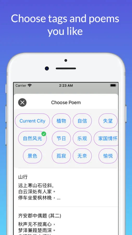 - 根據你的喜好或心情標籤篩選出相應詩詞。