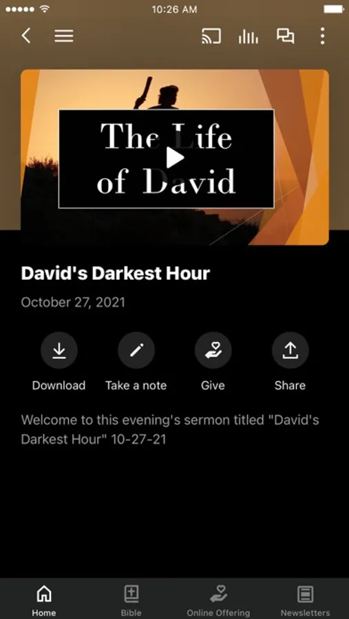 This app will help you stay connected with the day-to-day life of our church. With this app you can: watch or listen to past messages; stay up to date with push notifications; share your favorite messages via Twitter, Facebook, or email; and download messages for offline listening.