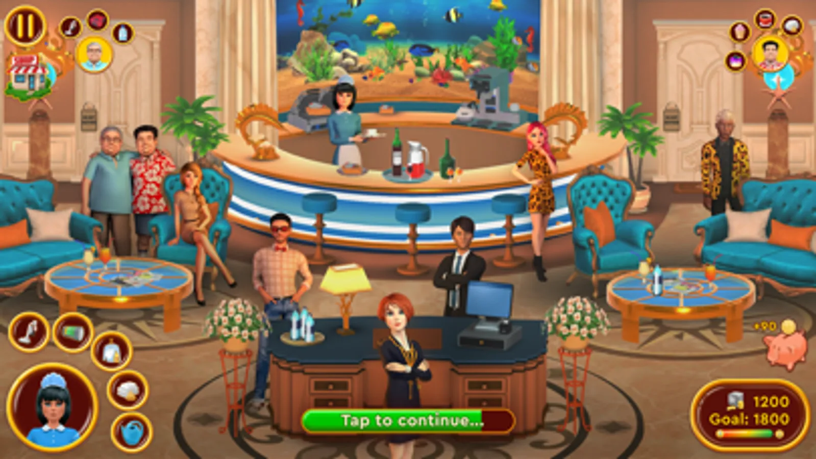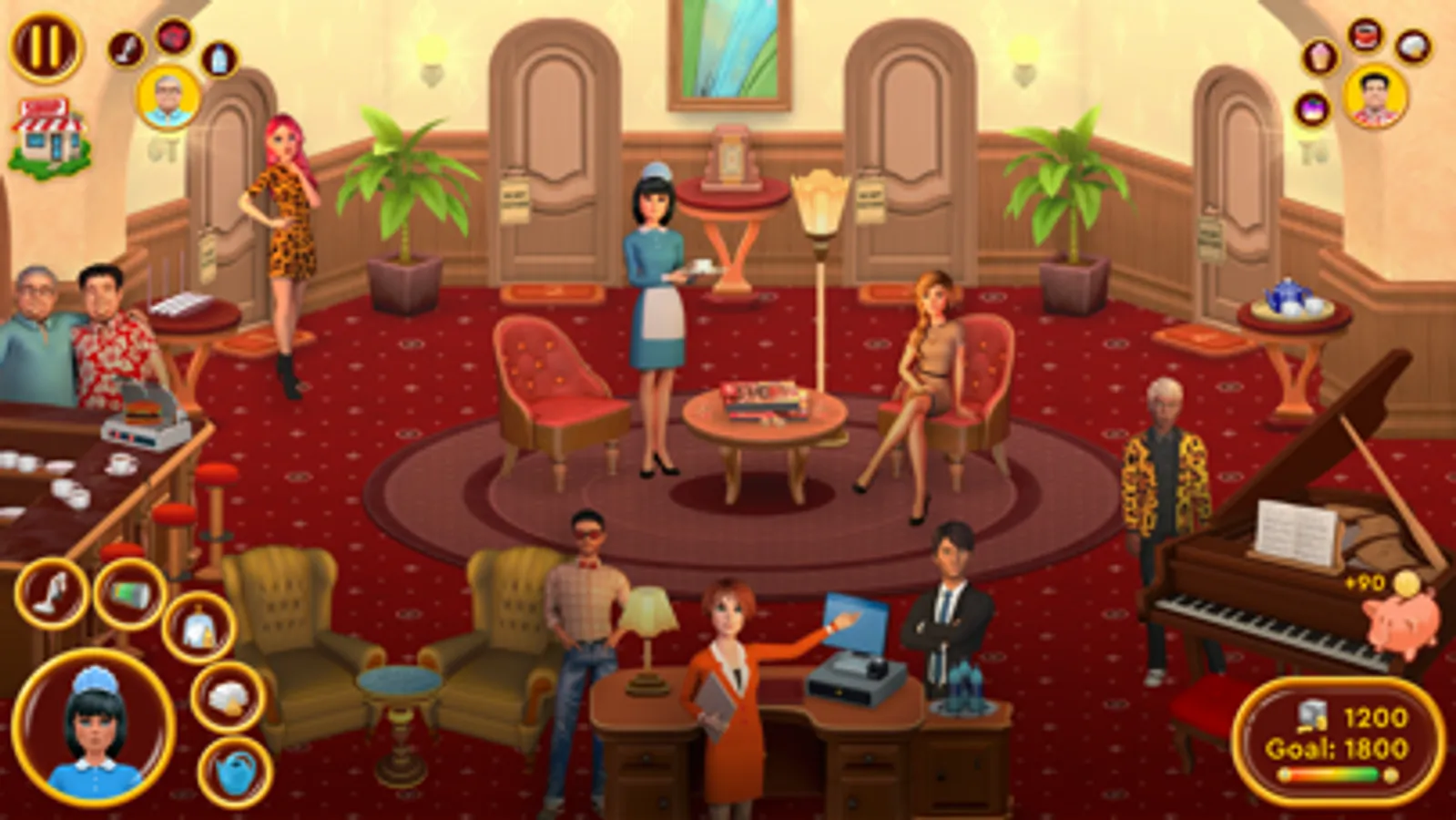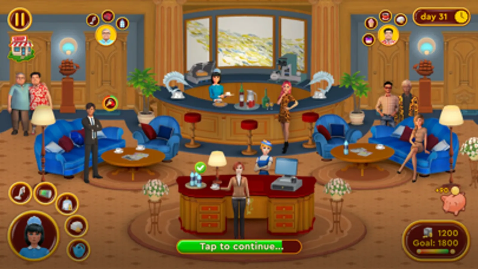 Three different hotels, each one is bigger and more challenging. Each hotel has a lot of upgrades which increase its popularity. When hotel popularity grows you can buy a Star-Up - that adds a new star to the hotel and totally upgrades its appearance. Upgrades increase popularity and more different guests will be attracted to your hotels.