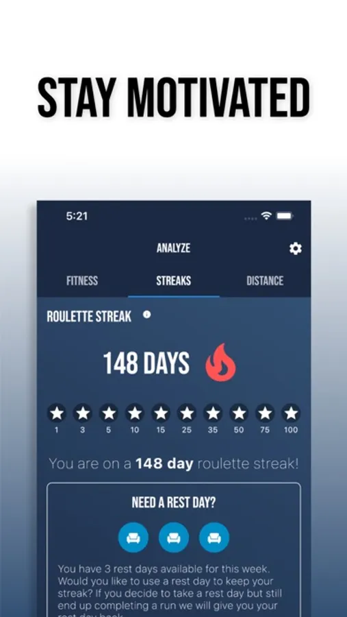 Track your running streak with Run Roulette and easily share your accomplishments to social media and Strava. Taking a day to recover and rest is an important component of any training plan, don’t compromise your training and become injured to keep your streak alive. Run Roulette has short-run options (runs lasting 30 minutes or less) or you can save your streak with Run Roulette’s ‘Day Off’ feature.