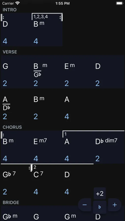 * Set bass notes for slash chords and inversions, e.g. G/B.