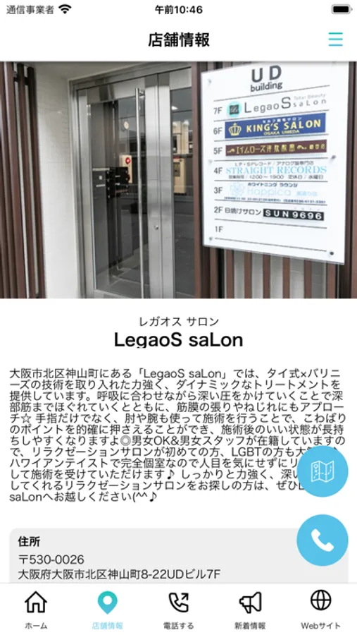 店舗のマップが表示され、地図アプリとも連携しているので、初めてのご来店の時も簡単に見つけることができます。