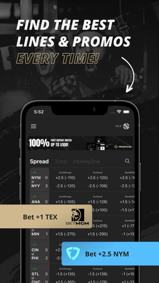 Compare odds and promos across all your books side-by-side! No more hopping from book to book. View spreads, totals, and moneylines across football, basketball, baseball, mma, boxing, and hockey. This includes odds from books like FanDuel, DraftKings, Bet Rivers, PointsBet, BetMGM, Barstool Sportsbook, Caesars, FoxBet, Unibet, and more!