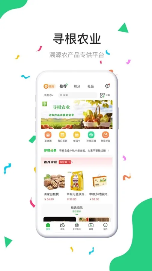 寻根农业是为用户提供更多优惠的农产品,我们不忘初心,带动农村地区经济发展,提供更多农副产品销路,也让更多人体验田园乐趣。