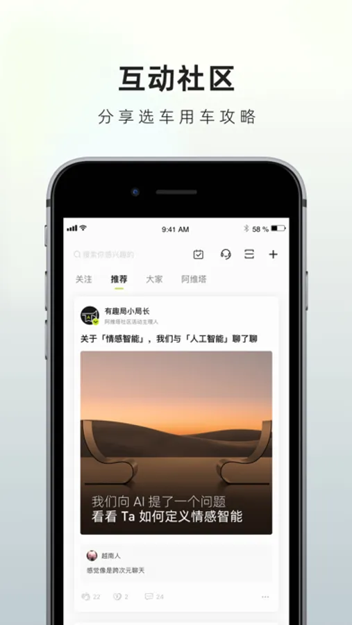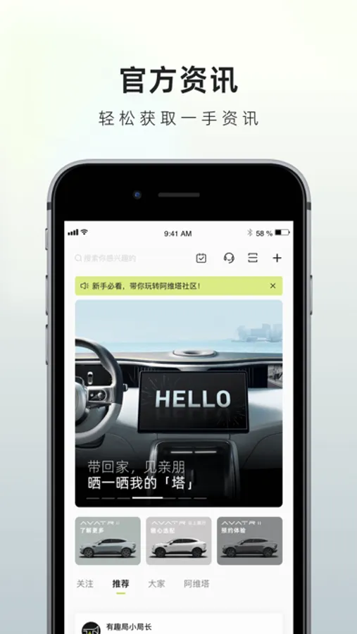 嗨,欢迎来到阿维塔App!这里有有趣及时的官方资讯、系统全面的的车辆信息、丰富多样的社区内容、让有趣的灵魂相遇、让不同的声音被看见、让新奇好物打开新世界,和更多人一起探索悦己生活。