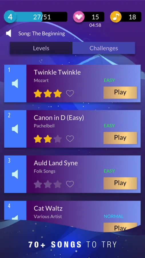 - Play piano songs and hit 6 milestones in each song: earn up to 3 stars then up to 3 trophies