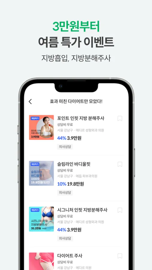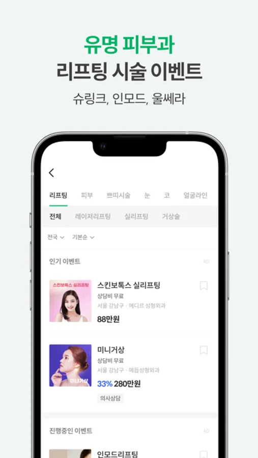 지금 피부과, 성형외과 이벤트 확인하고 집에서 특가 이벤트 상담까지 받아보세요.
