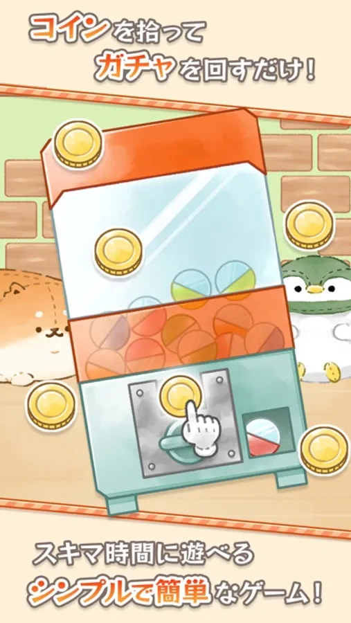 操作は簡単。ガチャを回すのに必要なコイン(お金)は、地面に落ちているのでタップして拾ってね。アプリ内課金の無い完全無料。オフラインでも楽しめるシンプルで簡単なゲームだよ。