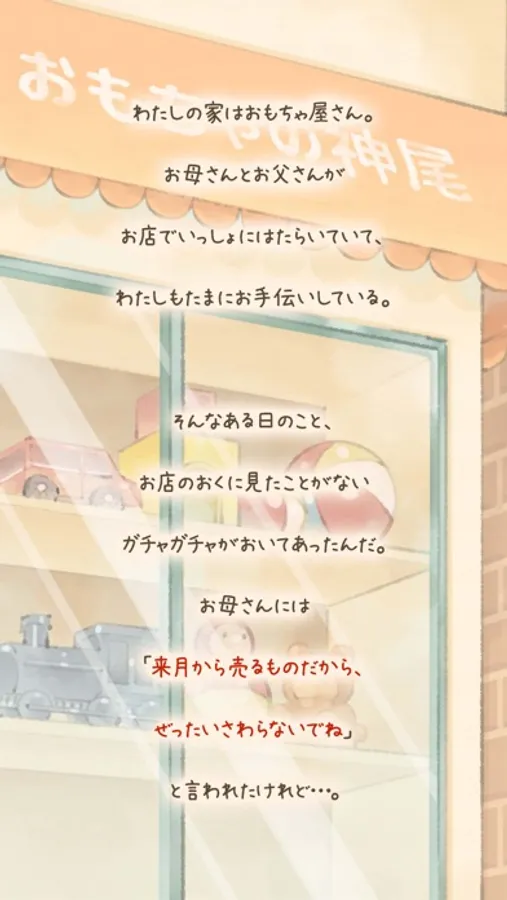 そんなある日のこと、お店のおくに見たことがないガチャガチャがおいてあったんだ。 お母さんには「来月からうるものだから、せったいさわらなにでね」 と言われたけど・・・。