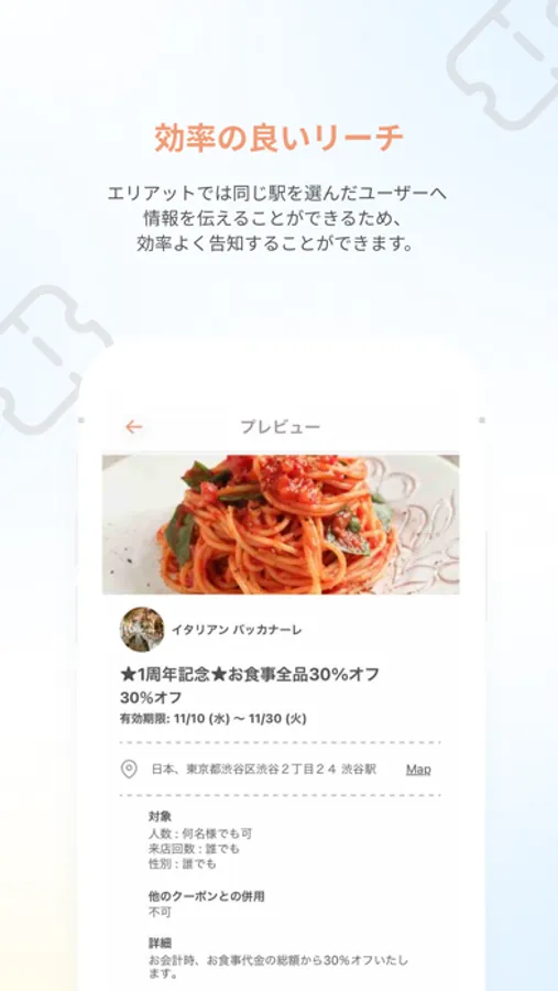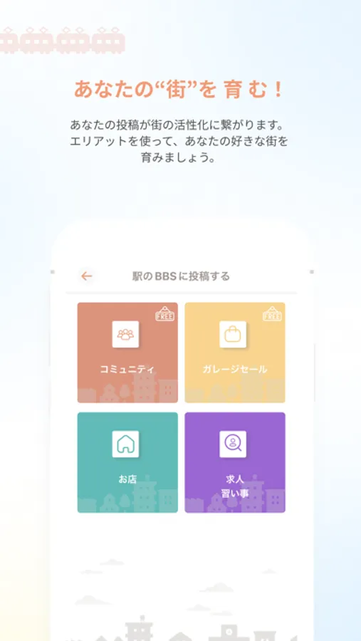 あなたの街を一緒に盛り上げましょう!エリアットは地域密着完全招待制SNSです。ユーザーのみなさんに街の情報を作り上げていただきます。最大3つの駅を登録することができ、駅の情報を見たり、投稿したりすることができます。駅の掲示板情報は4つの項目、「コミュニティ」、「ガレージセール」、「お店」、「求人・習い事」にわかれてます。コミュニティはその駅で仲間を作ったり、参加して地元の輪を広げ、ガレージセールは引っ越しなどで近くに住む方に譲ったり、お店はクーポンなどを出したり、求人・習い事は近くの人に限定した求人を出せたりします。その地域でビジネスを行っているユーザーには駅を指定して告知を行うことができます。その地域だけのお得な情報を得て、あなたの街を盛り上げましょう!
