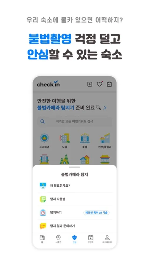[불법카메라 AI 탐지] 자체 개발 특허 AI기술을 활용한 탐지 기능을 이용해 숙소 내 불법촬영 걱정 없이 안심하고 머무르세요.