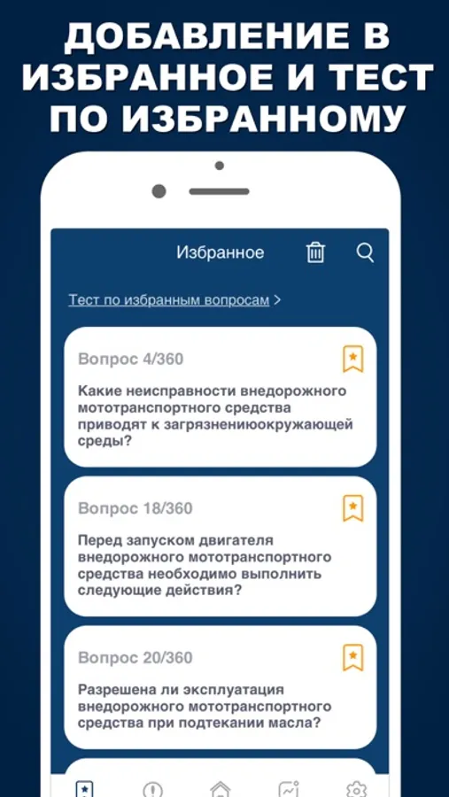 ► Избранное - можно добавлять вопросы в Избранное из всех трех режимов, а также из Топа ошибок.