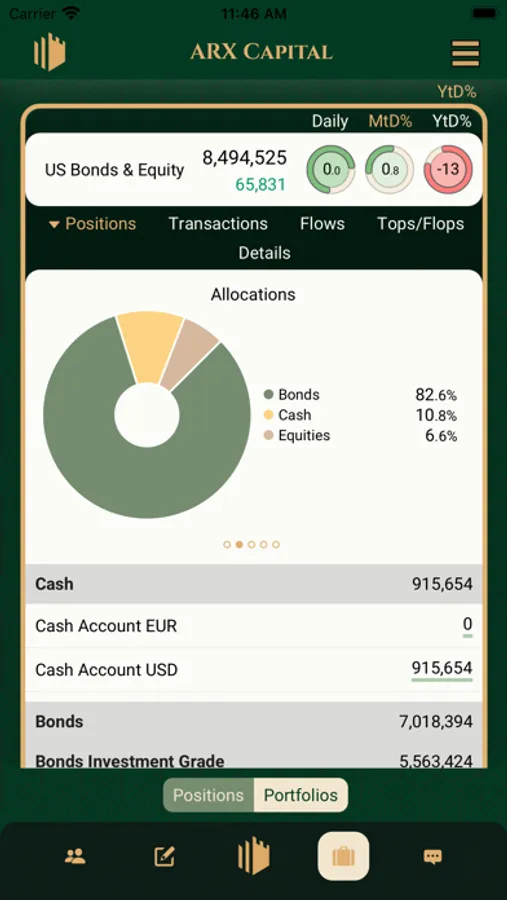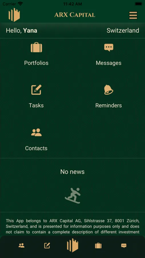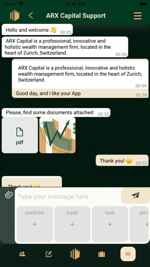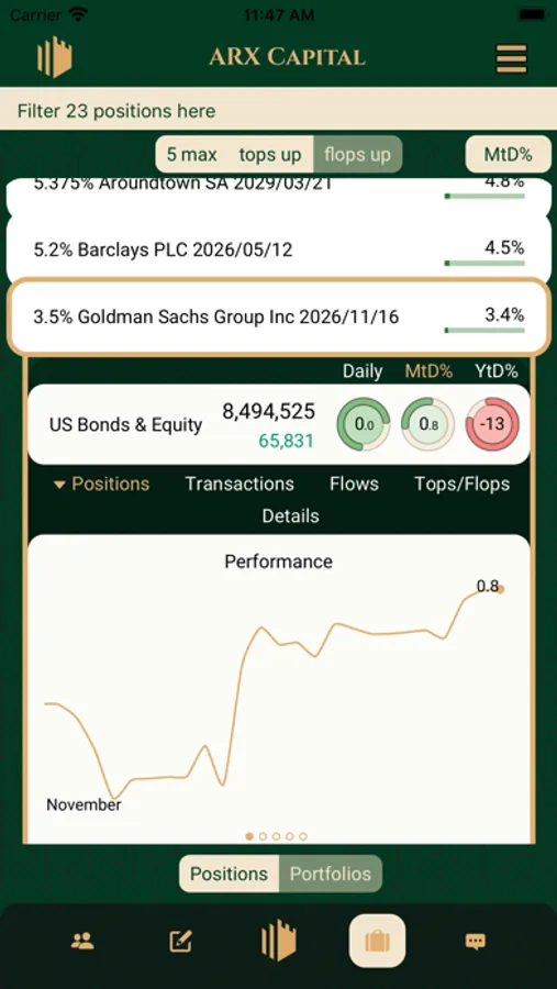Our App has 5 key functionalities. It aggregates in one place all your necessary ARX Capital contacts, daily business tasks and document workflows, allows you to see a performance-ranked list of individual investments as well as consolidated portfolios on your radar, and communicate with us via a dedicated and secure channel.