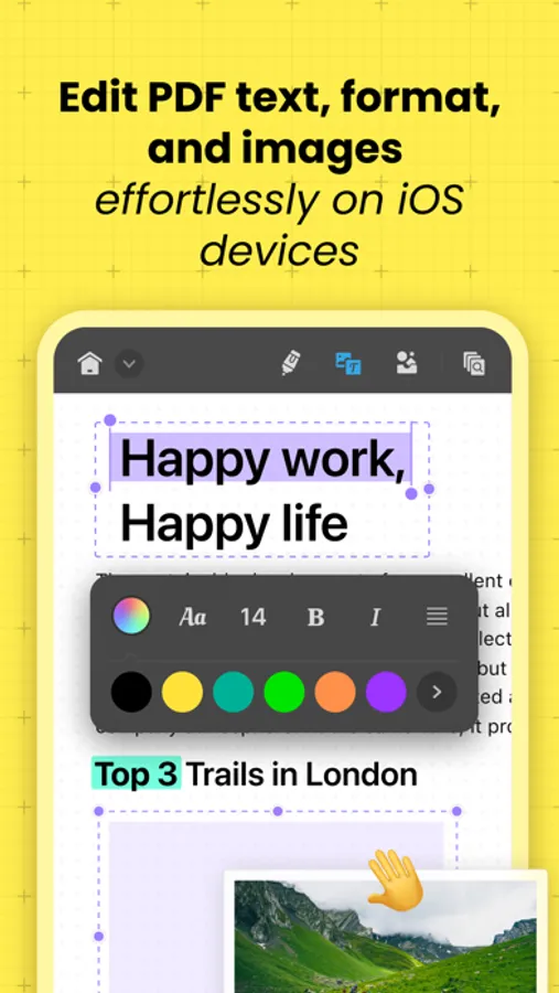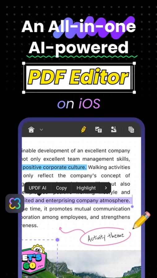 UPDF for iOS is a full-featured PDF editor app that supports every file management action including view, edit, annotate, convert, organize, crop, search, copy&paste, delete, rename, compress, decompress, move, upload&download, share, and secure PDF documents from your iPhone or iPad.