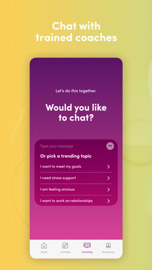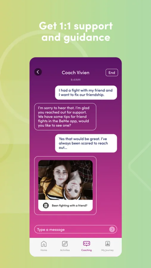 -Trained BeMe coaches are here to guide you through your challenges, teach you skills, and help you set goals. They offer 1:1 support and direct you to the resources and content that will help you feel better and thrive.