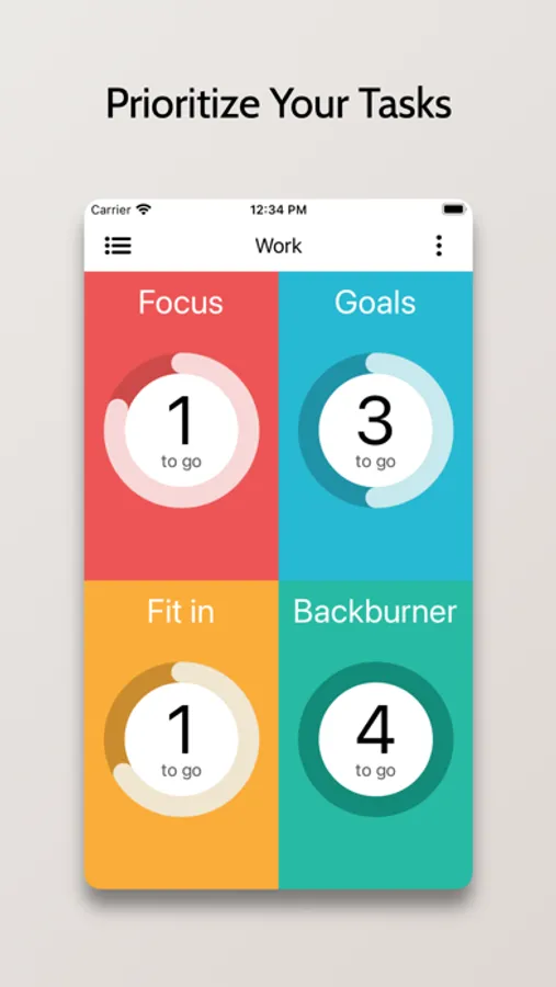 Prioritize tasks, todos, and reminders into a priority matrix depending on their importance/urgency. Prioritizing tasks upfront is the cornerstone of Done, prioritizing a task is the first thing you do, rather than selecting it afterwards.