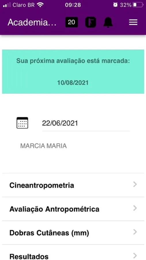 3- Avaliação: O aluno poderá visualizar suas avaliações físicas no Aplicativo.