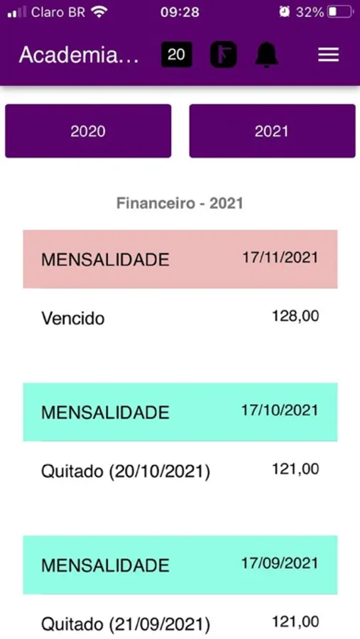 4- Financeiro: O aluno poderá verificar os valores pagos no ano atual e anterior, além de todas as mensalidades em aberto.