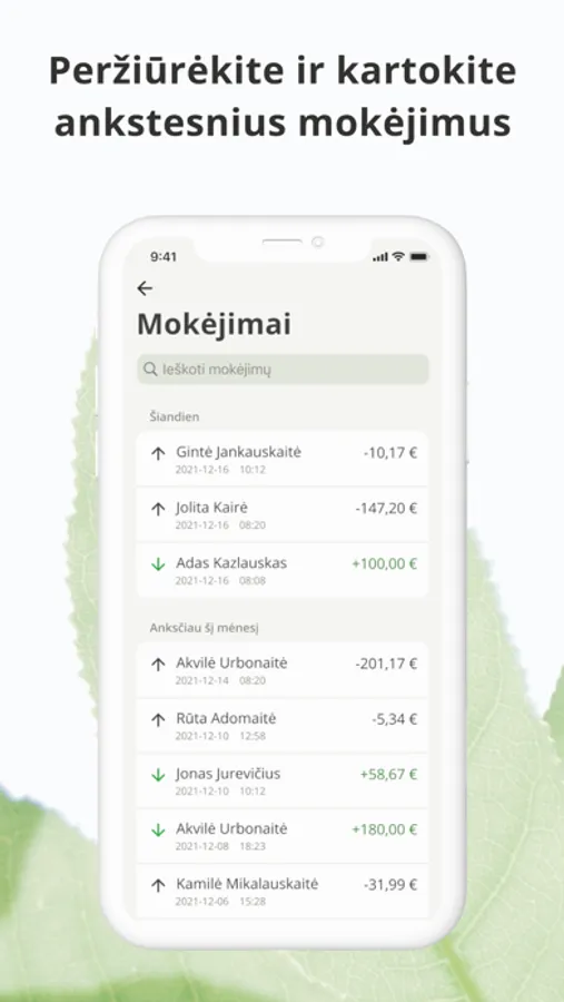 • Peržiūrėkite paskutinius atliktus mokėjimus.
