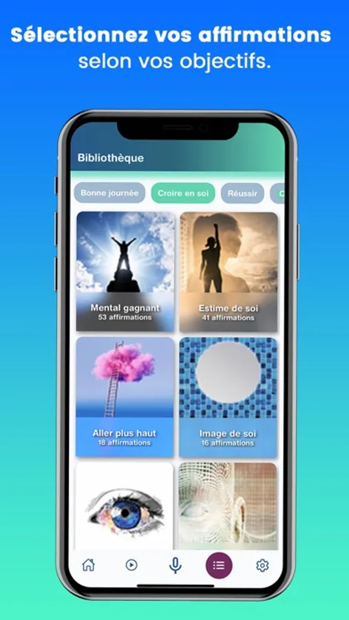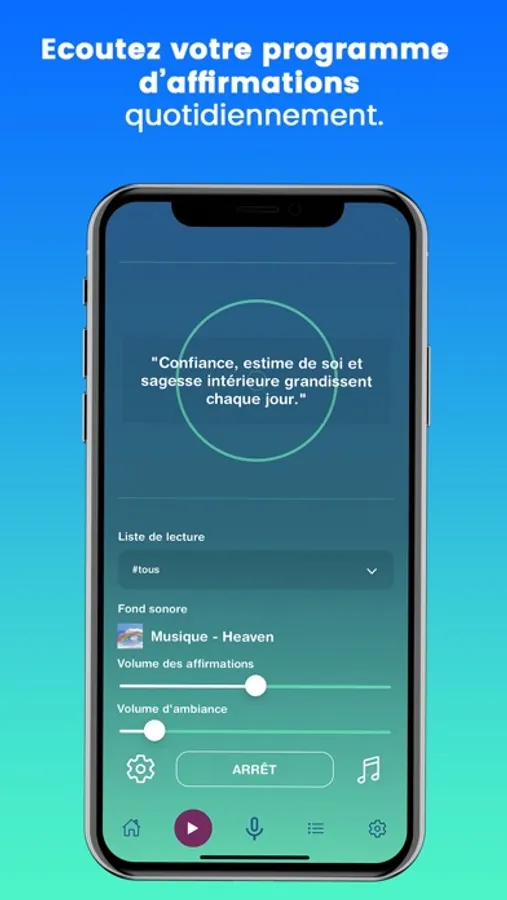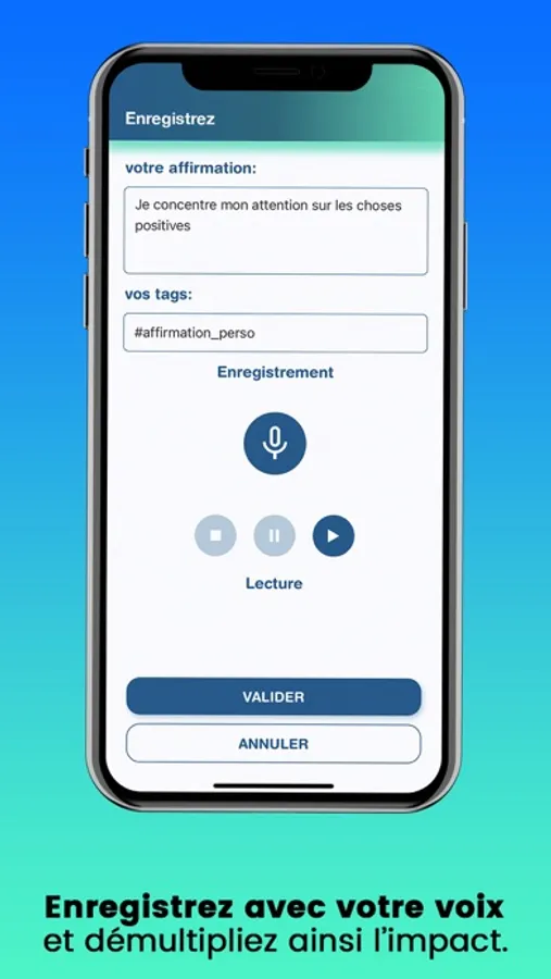Nous avons réuni dans cette app près de mille affirmations positives classées par thème parmi lesquelles vous pourrez faire votre sélection et créer ainsi votre programme personnalisé, enregistré avec votre propre voix, décuplant ainsi son impact.