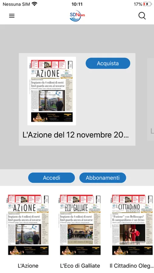 Con la nostra applicazione potete ora leggere in digitale tutte e dieci le nostre edizioni con un singolo abbonamento: L’Azione di Novara, L'Eco di Galliate, il Cittadino Oleggese, Il Ricreo di Bellinzago, Il Sempione, L’Informatore di Borgomanero, Il Monte Rosa, L’Informatore del Cusio, Il Verbano e il Popolo dell’Ossola.