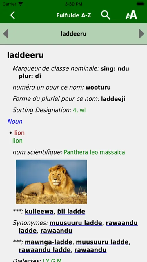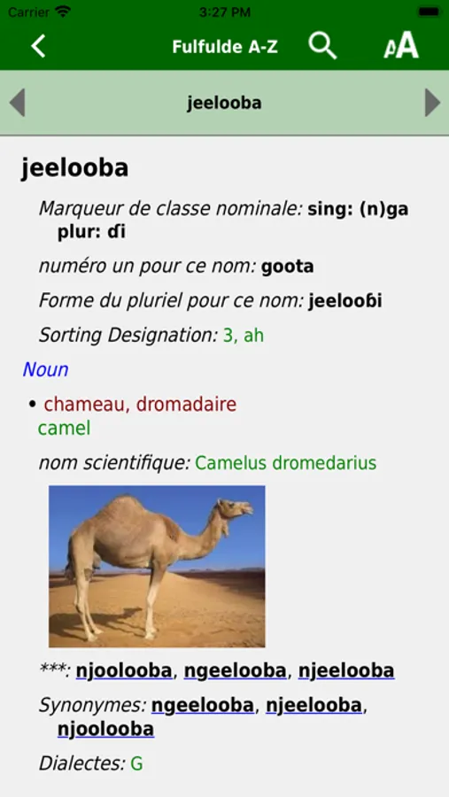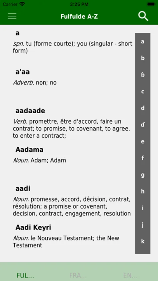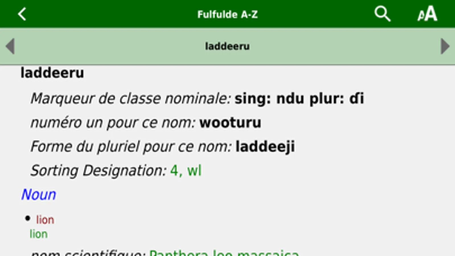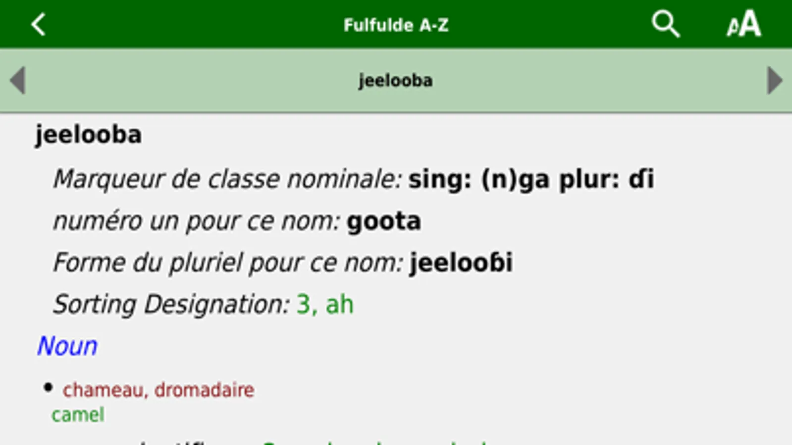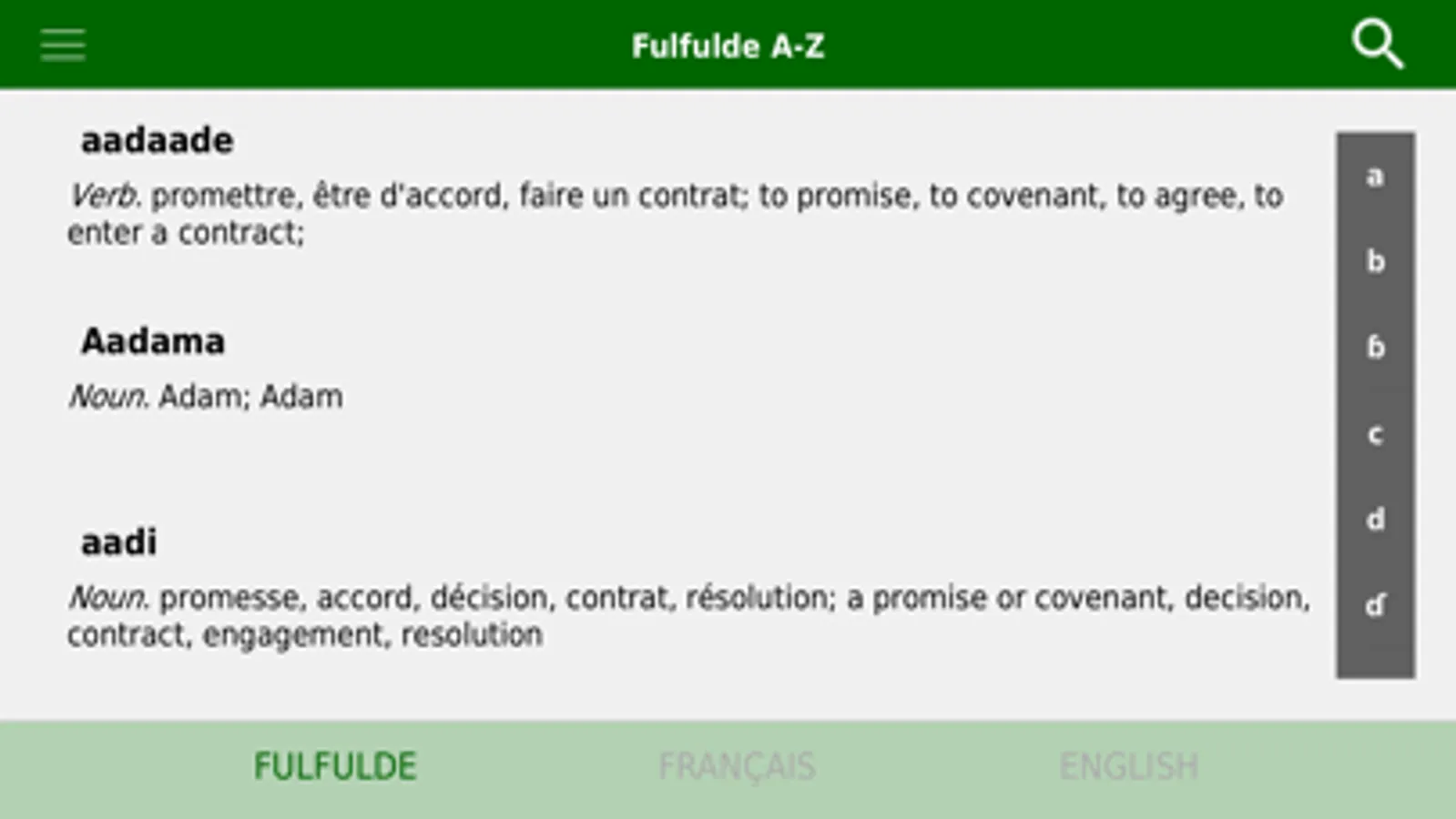 Dictionnaire trilingue Fulfulde - Français - English avec fonctions de recherche des mots soit en fulfulde, soit en français, soit en anglais.