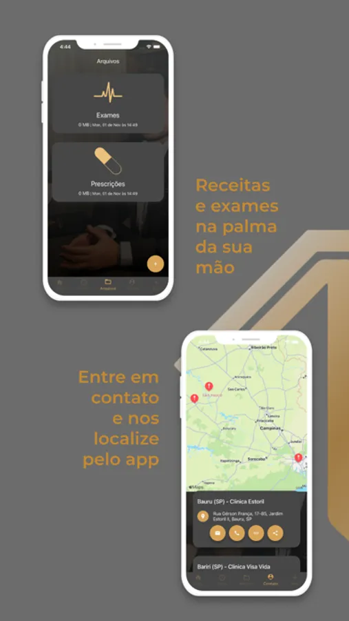 Agora você pode agendar consultas, ter receitas e exames sempre disponíveis no seu celular e receber lembretes de medicações e consultas através do nosso aplicativo.