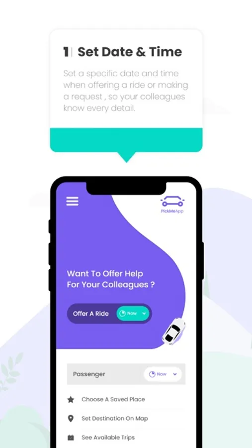 - Set a specific date and time when offering a ride or making a request, so your colleagues know every detail.