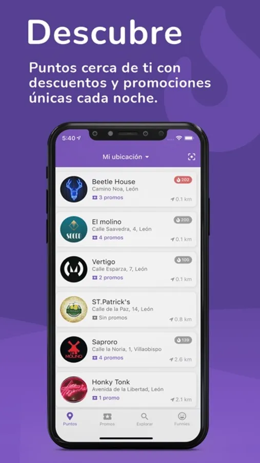 2.- Ahora toca lo mejor y lo más complicado ;) elegir que plan te apetece. Cada uno de nuestros Puntos publica sus mejores promociones cada día y puedes elegir que descuento te apetece más ¡o que Punto está que arde esa noche! Los Puntos que aparecen con un icono de una llama son en los que más promos se están escaneando. Ya sabes, ¡donde hay gente hay vida!
