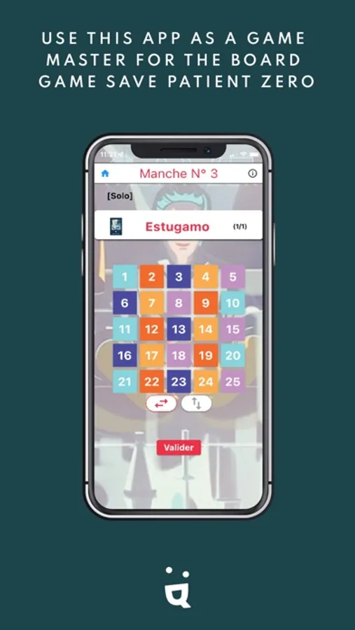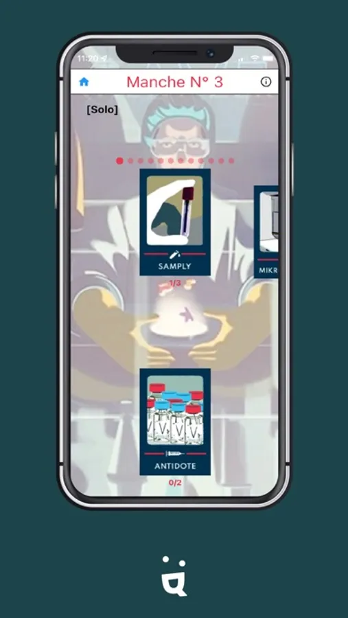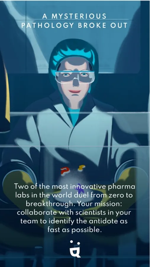The app is a companion for the board game Save Patient Zero, in which two labs compete to identify an antidote made. Out of 25 possible molecules, find the three that make up the cure. The general idea of the game is to use lab tools in the most efficient order. Whoever finds the antidote first wins the game.