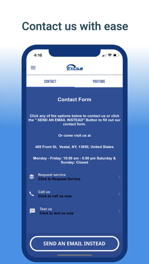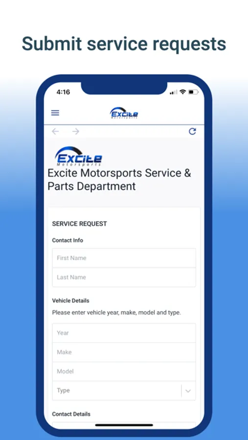 Welcome, To Excite Motorsports! Using our Mobile app you can view our inventory, submit service requests, Get a custom search done, talk to our team, view more about our company and much more all using our mobile app.