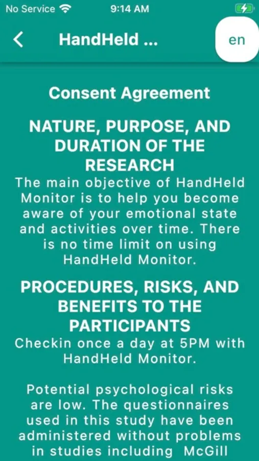 The objective of HandHeld Monitor is to help you become aware of your emotional state and activities over time.. Checkin once a day at 5PM.