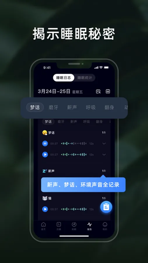 - 记录您睡觉过程中的梦话、鼾声、磨牙,甚至夜间的环境噪音和宠物的动静。