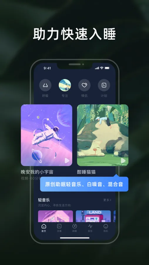- 联合国内外睡眠、冥想、心理领域的机构专家与知名疗愈音乐制作人打造白噪音、轻音乐、脑波音乐等原创助眠音乐,给您暖心的睡前陪伴,帮您快速入眠。