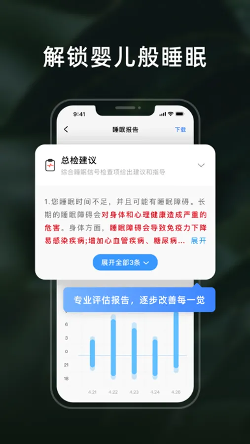 - 独家算法分析睡眠数据,生成可视化报告,并提供个性化的睡眠建议,改善您的睡眠质量。