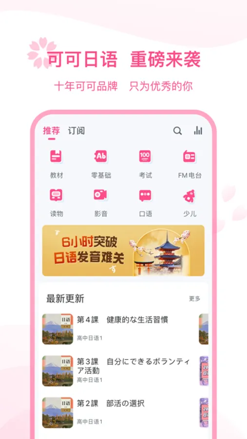 可可日语,专为年轻人打造的日语学习工具,丰富贴心的功能可以满足您日语听力口语训练等方面的学习需求。