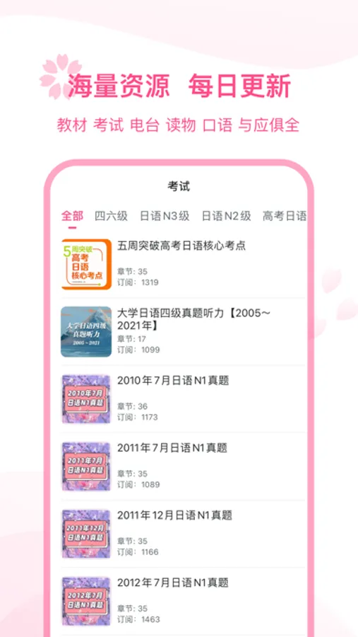 1、日语真题:2010-2019年日语N1~N3考试真题,语音同步中日双语字幕;