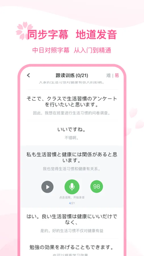 2、海量内容:100+优质日语节目,语音同步双语字幕,超过2万篇有声资源;