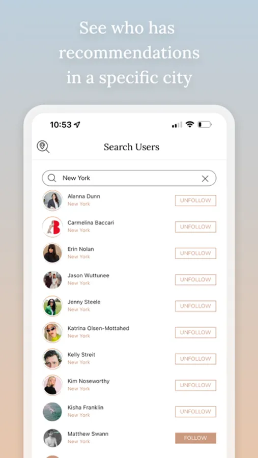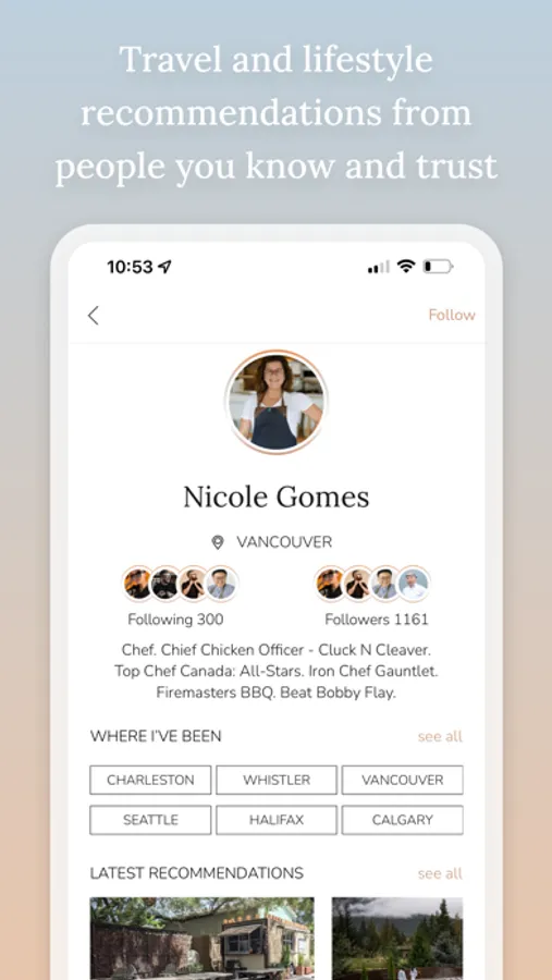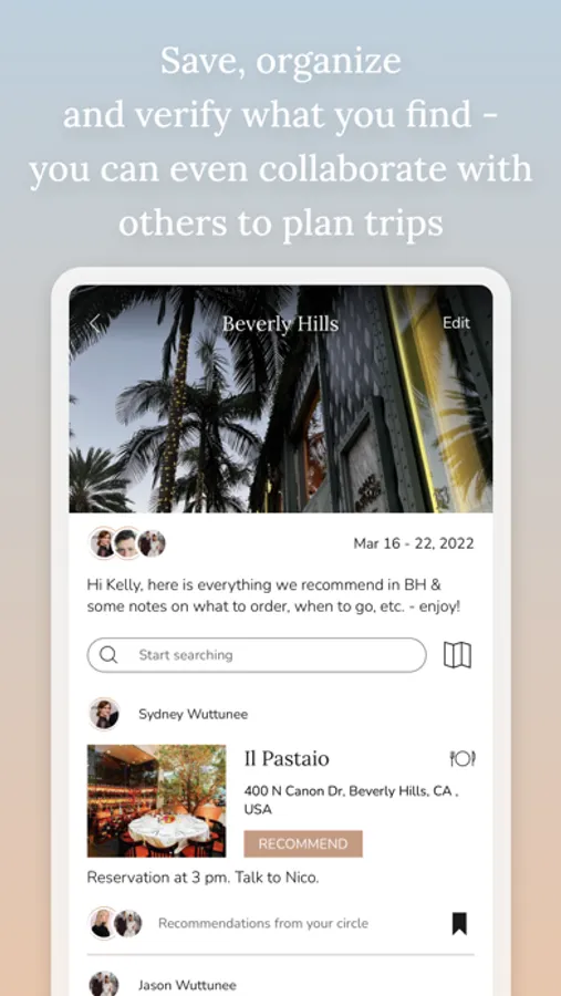 Search other members to see their recommendations for where you’re going. See who loves the same restaurants as you and what else they recommend; find your favourite yoga teacher’s favourite yoga teacher.