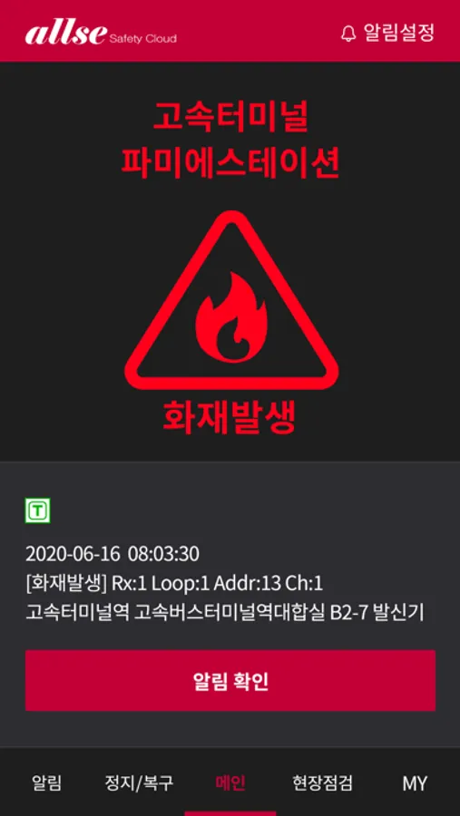 allse Safety Cloud 서비스는 화재수신기와 연동하여 이벤트정보를 수집 관계자에게 화재발생정보, 감시정보, 장애정보 등을 실시간으로 전송하며 경보제어, 점검이력관리, 월별점검관리 등을 통합한 앱 서비스 입니다.