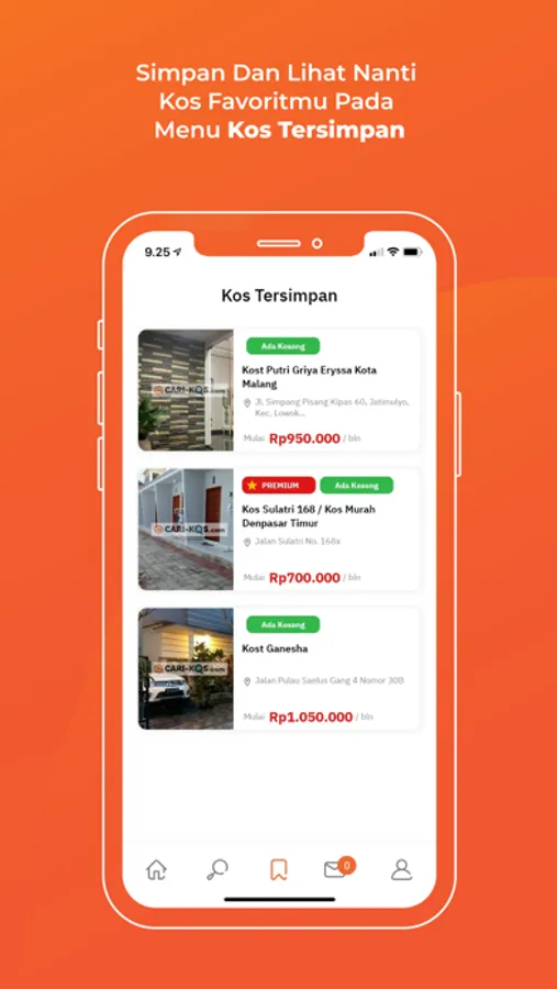 Sedang sibuk dengan aktifitas dan tidak sempat melihat detail kost? Tenang, aplikasi Cari-Kos.com dilengkapi dengan fitur Simpan Kost sehingga pencari kost dapat menyimpan kost favoritnya terlebih dahulu dan melihat nanti pada fitur "TERSIMPAN". Disini akan terdapat list kost yang sudah disimpan pengguna.