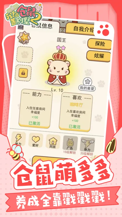一款休闲益智的仓鼠养成小游戏,不断丰富你的别墅家具,提高楼层,获得更多的小仓鼠。
