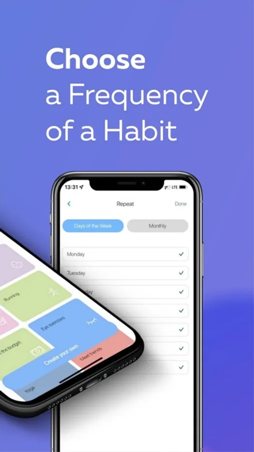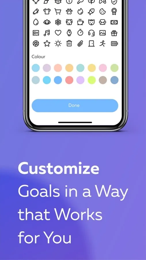 You can choose a unique icon, its color, a goal (quantity, ml, min, etc), and a frequency of a habit (every day, on certain days).