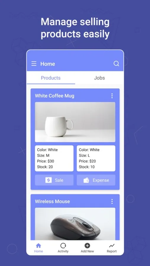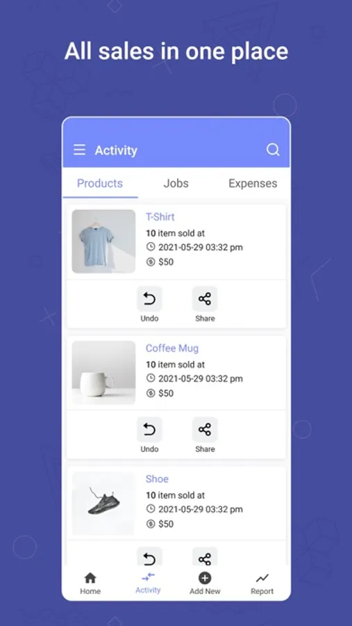 - Get a categorical activity view of products, jobs and expenses.