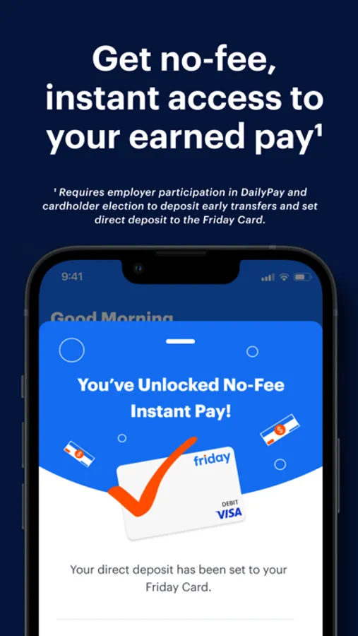 ¹ Requires employer participation in DailyPay and cardholder election to deposit early transfers and set direct deposit to the Friday Card.