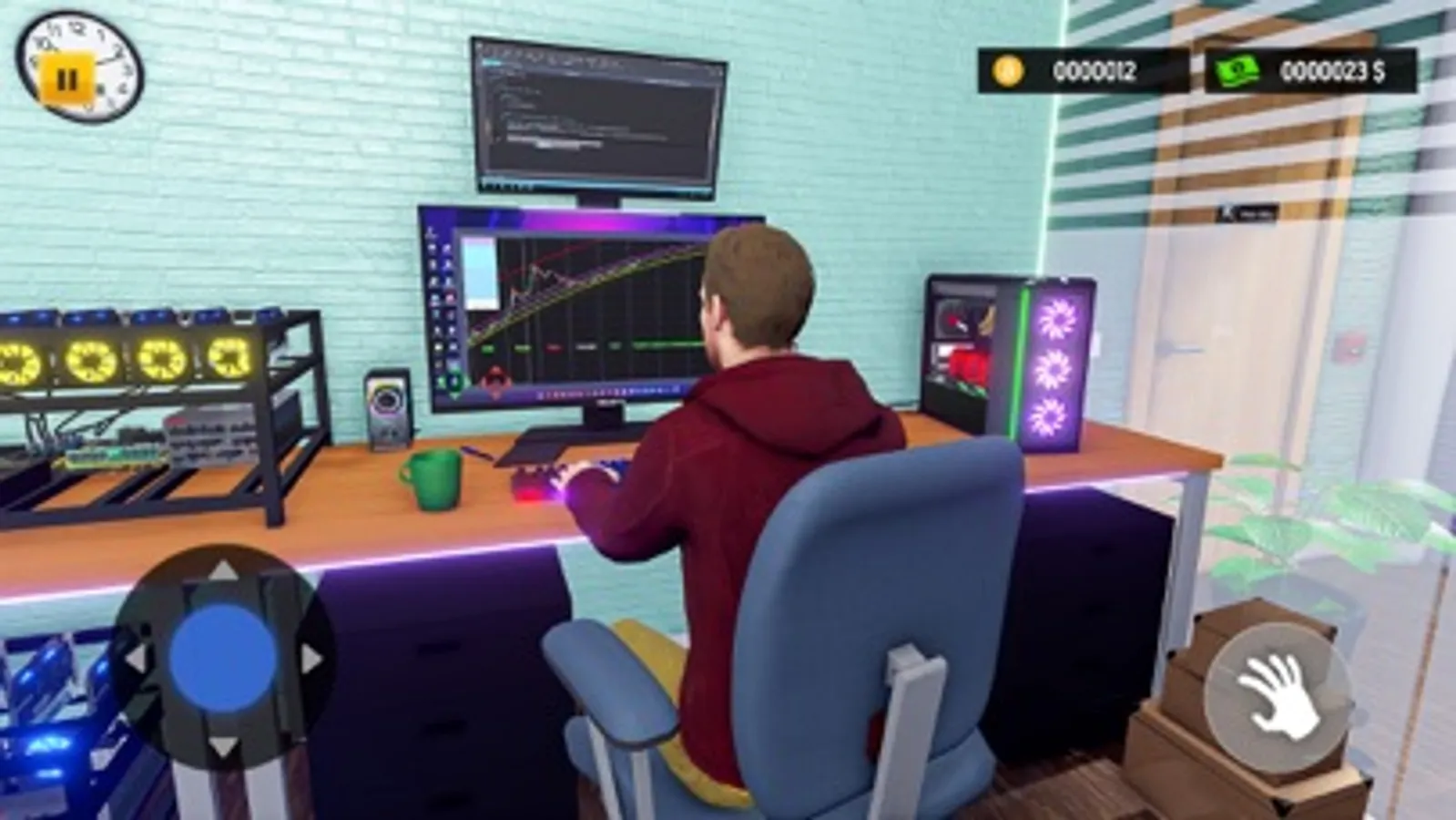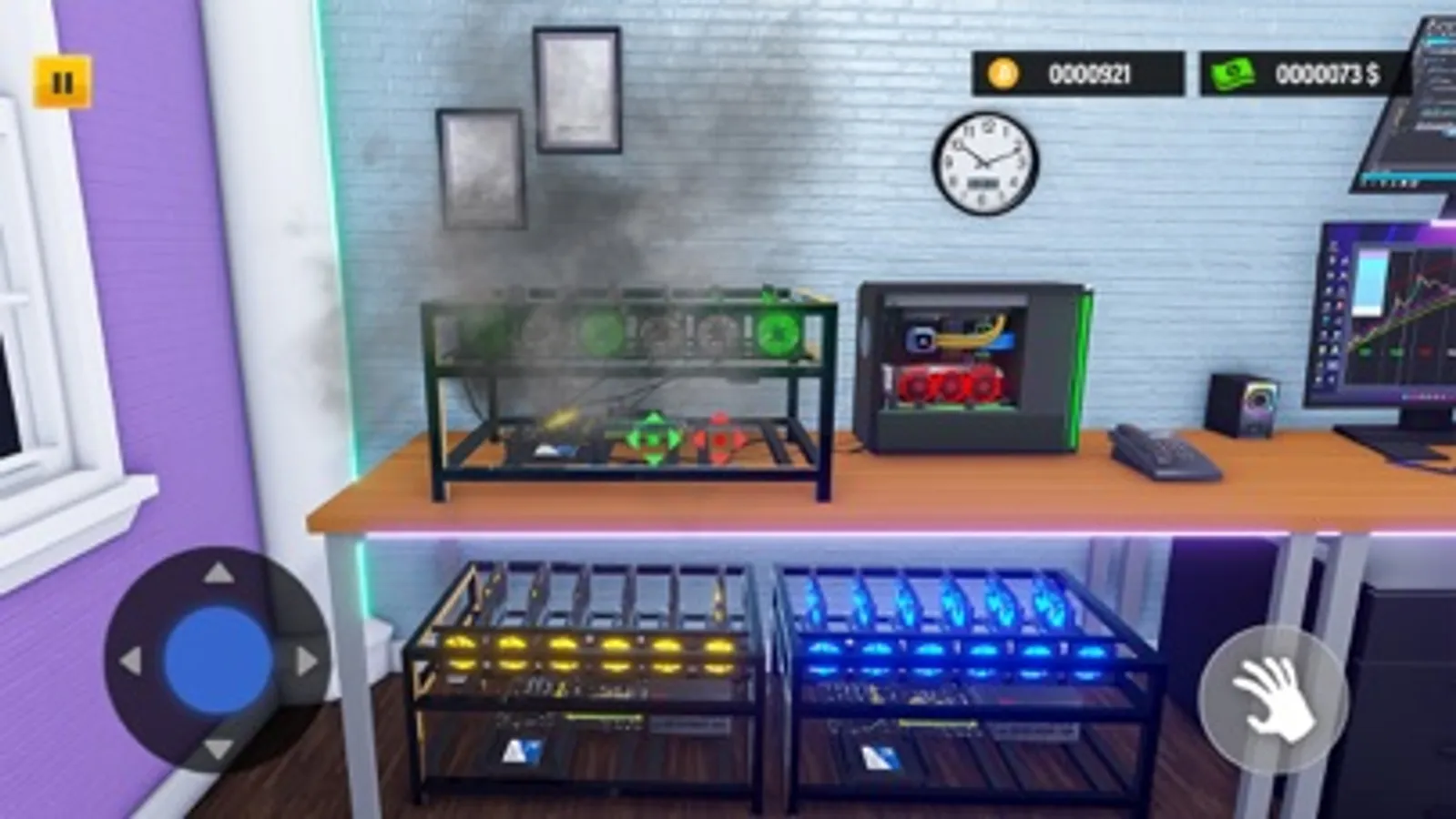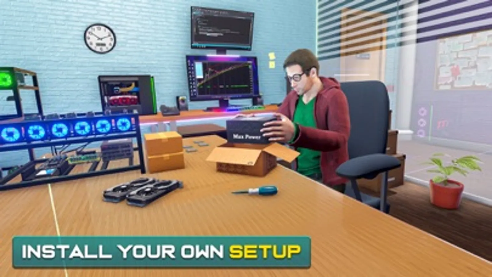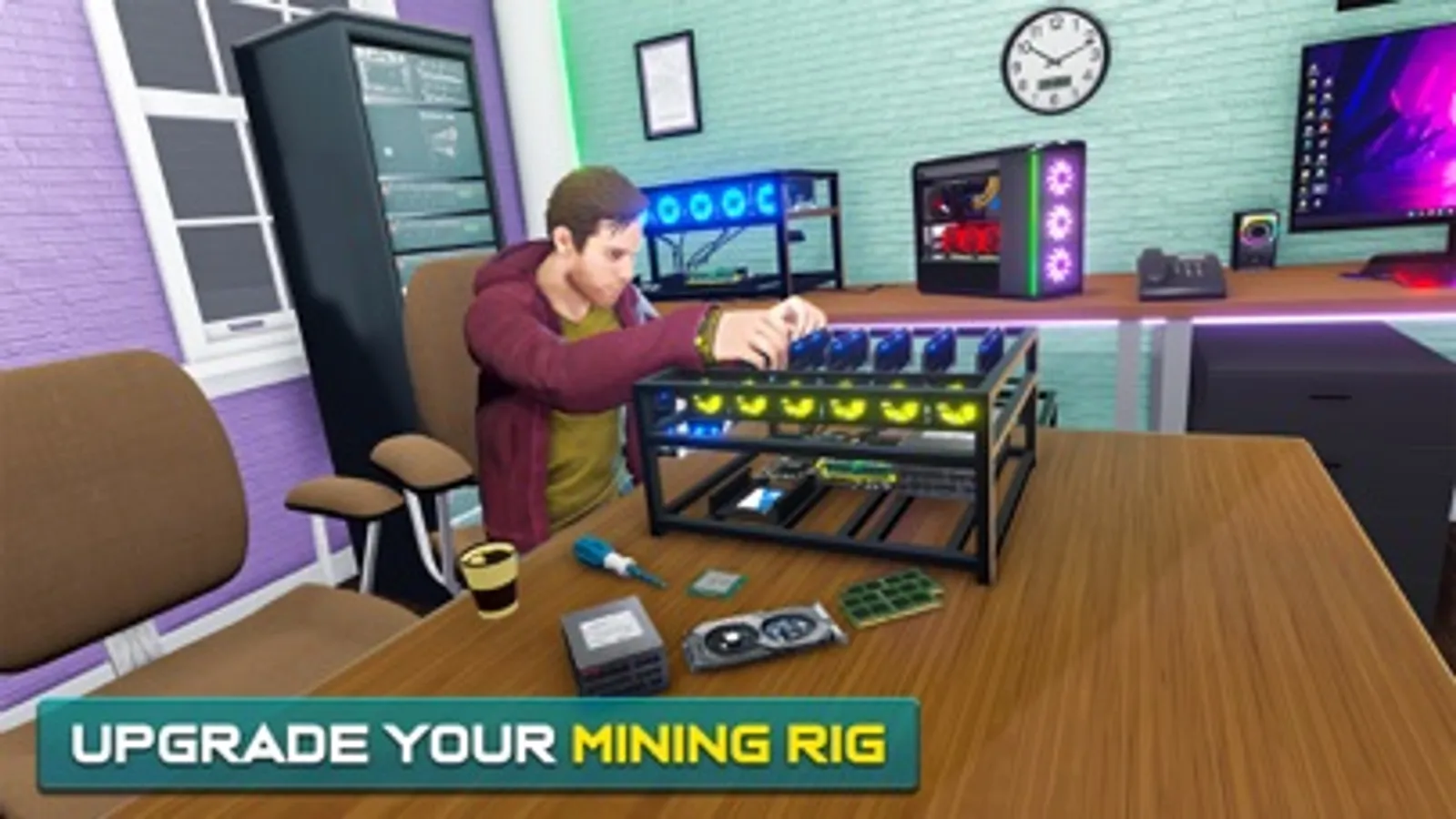 Build your mining rig, install Motherboard, CPU, Fans, GPUs, connect wires and cables. Design a cool gaming room with a mining farm and start making money!