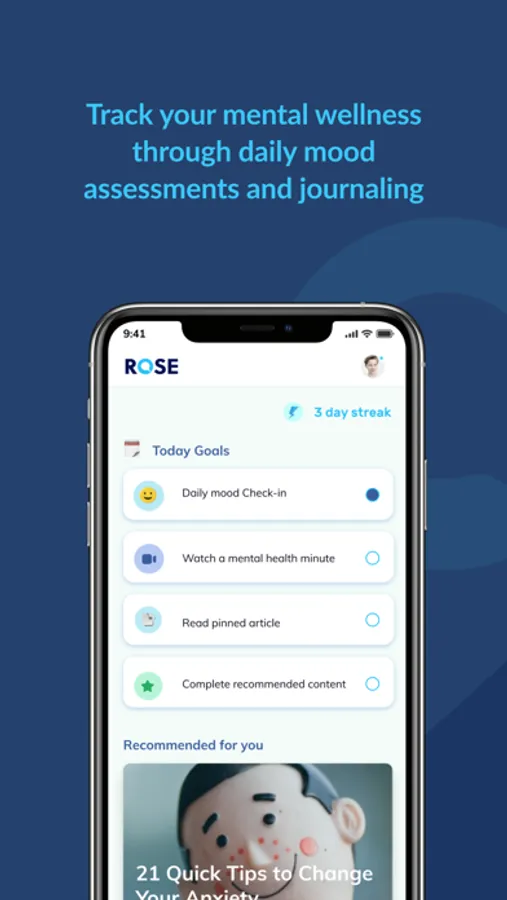 Rose Health Youth is a mental health-focused application that utilizes artificial intelligence to identify symptoms and provides targeted, tailored therapy solutions for its users. The application instructs the user to fill in timed mental well-being assessments and has an in-app journaling function. This is combined with targeted content (e.g., self-help articles), and the assessment results are shared with the individual delivering in-person psychotherapy.