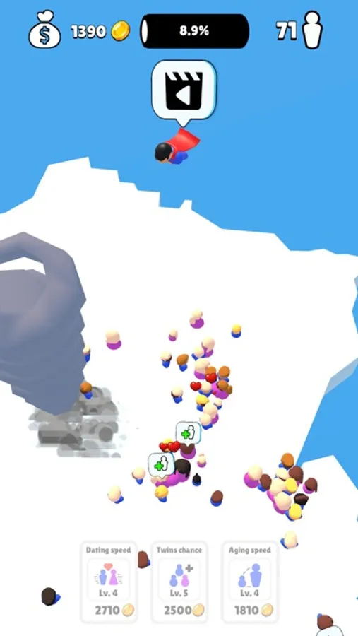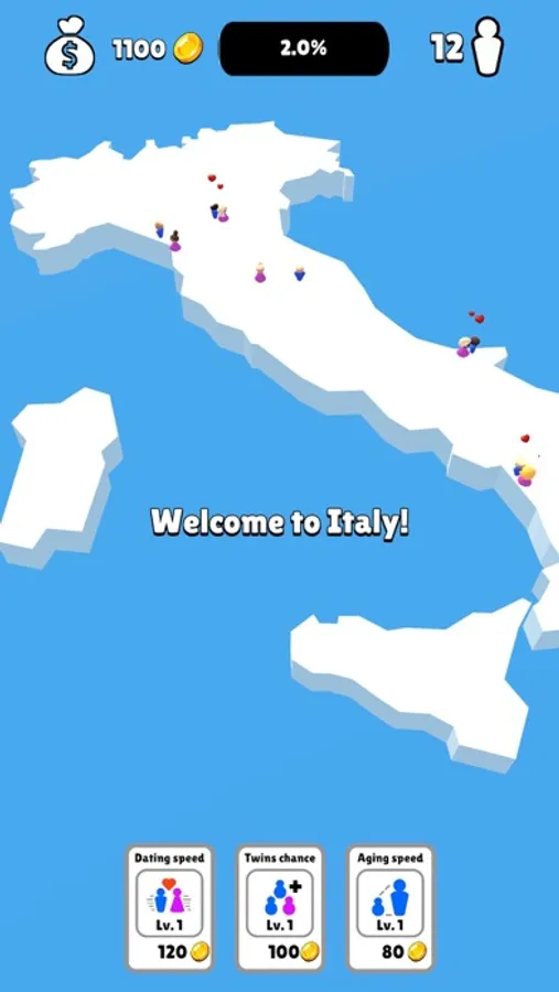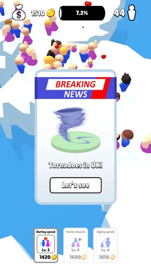 like in real life, wait for people to meet, date and fall in love. From their love will come babies, which in time will also make babies, etc, etc … For each birth you get money. Use it to purchase upgrades for your little humans: increase the speed of dating and aging so they can meet people faster ! Increase babies rates to get twins, triplets and more ! Start from 2 people, date / mate / birth and get more and more people,until you repopulate the whole planet ! “A romantic approach on humanity's primal mission: reproduce and populate. Get the God-like satisfaction of overseeing the earth, and watch your creations multiply under your eyes. A minimalist and contemplative simulation of how 2 people can multiply to populate the entire planet !