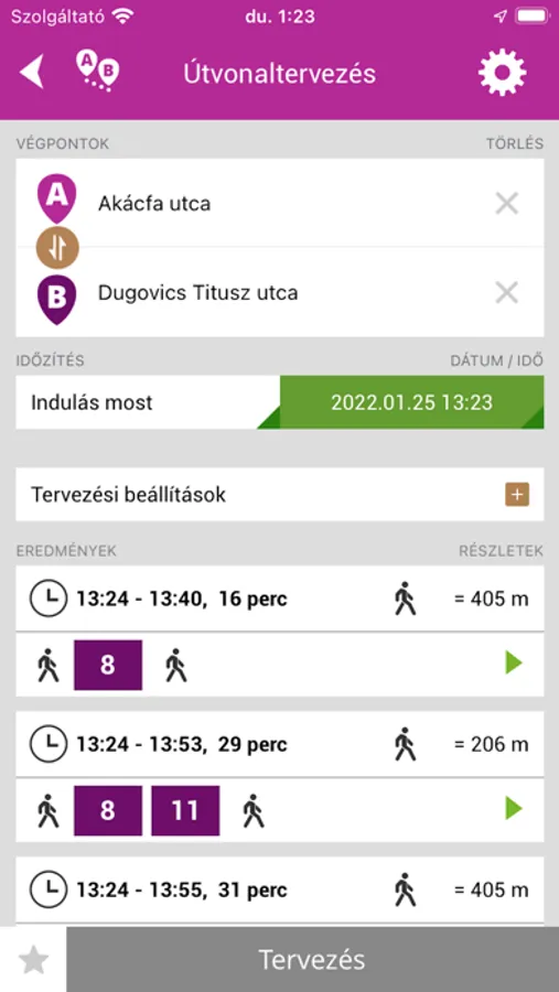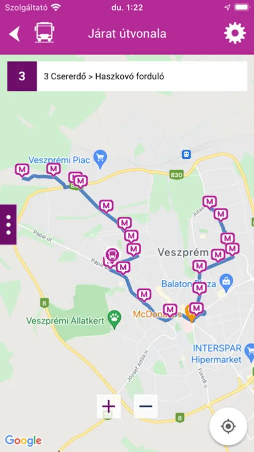 - térkép útvonalnézettel, megállókkal, aktív járatokkal