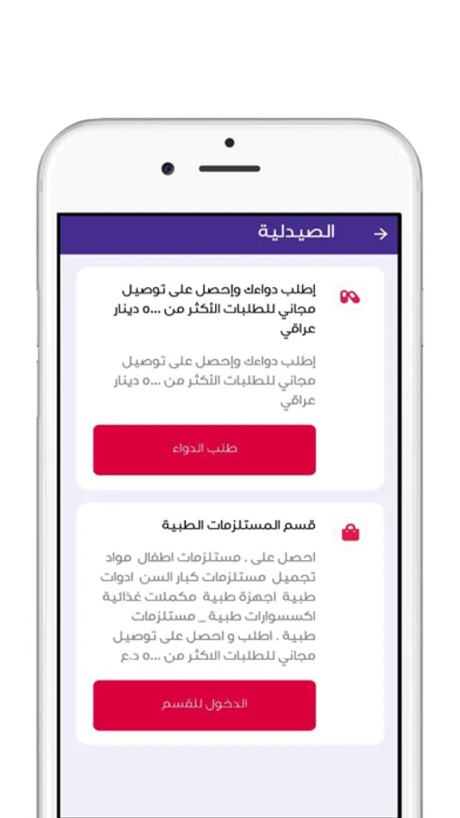توفر اقسام التطبيق (الطوارىء ، الاستشارات ، الصيدلية ، المستلزمات الطبية و الاقسام الاخرى) سيوفر لك قسم الصيدلية خدمة توصيل العلاجات لباب منزلك بسرعة و سهولة و بأسعار تنافسية جداً.